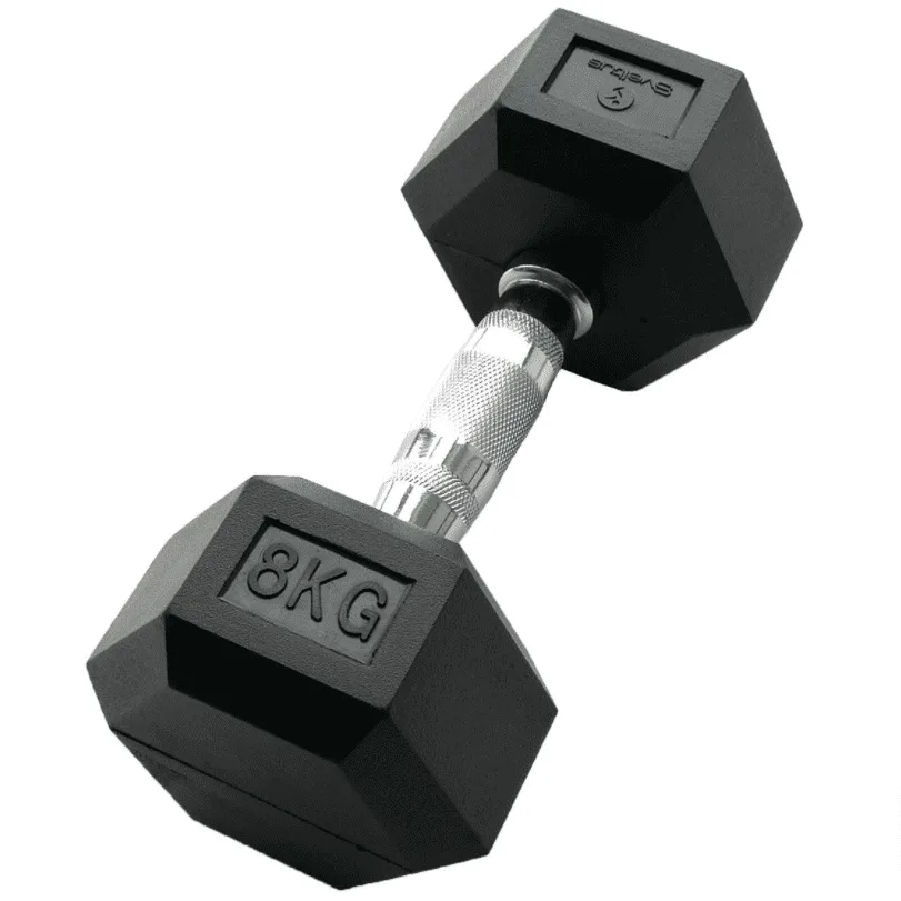 Sveltuse kuusnurkne hantel on kaetud vastupidava kummist kattega, mistõttu kaitseb see põrutuste eest ja vähendab müra. Ergonoomiline kroomitud käepide koos libisemisvastase alaga hea haarde tagamiseks. Hantli kuusnurkne kuju ei lase sellel maas veereda (6 veeremisvastast külge).