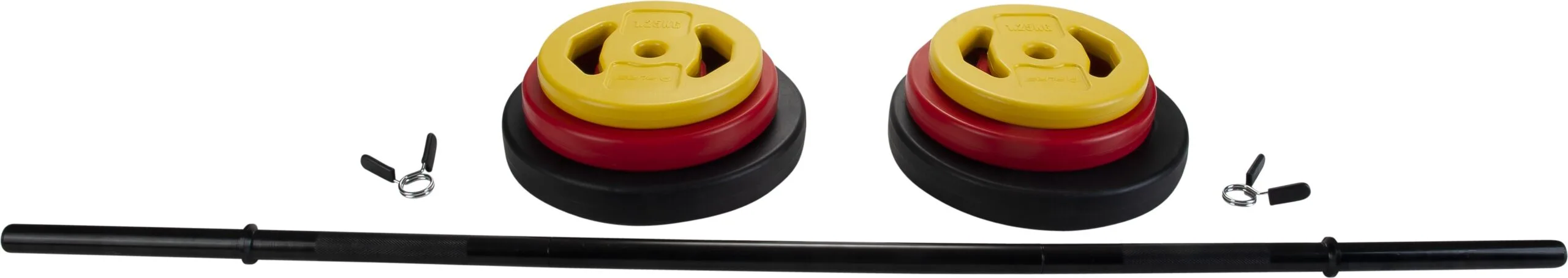 kokkupandavat kangi, kinnitusi ning kettaid, kogu raskusega 20kg. Kettad on paarikaupa: 2x5kg mustad, 2x2,5kg punased, 2x1,25kg kollased. Värvilised kettad tagavad kiire kaalu tuvastamise. Toru pikkus 130cm. Kogu raskus 20kg