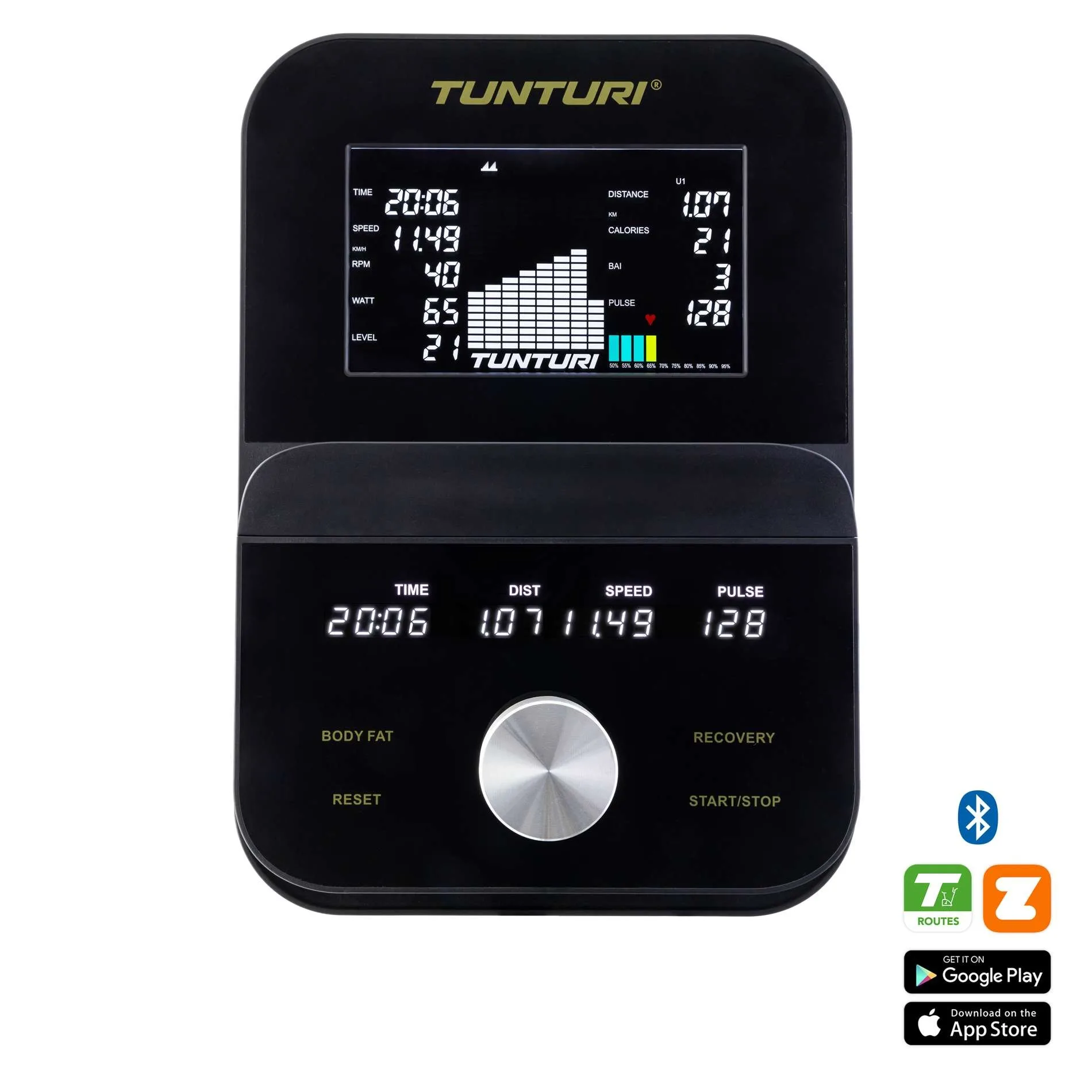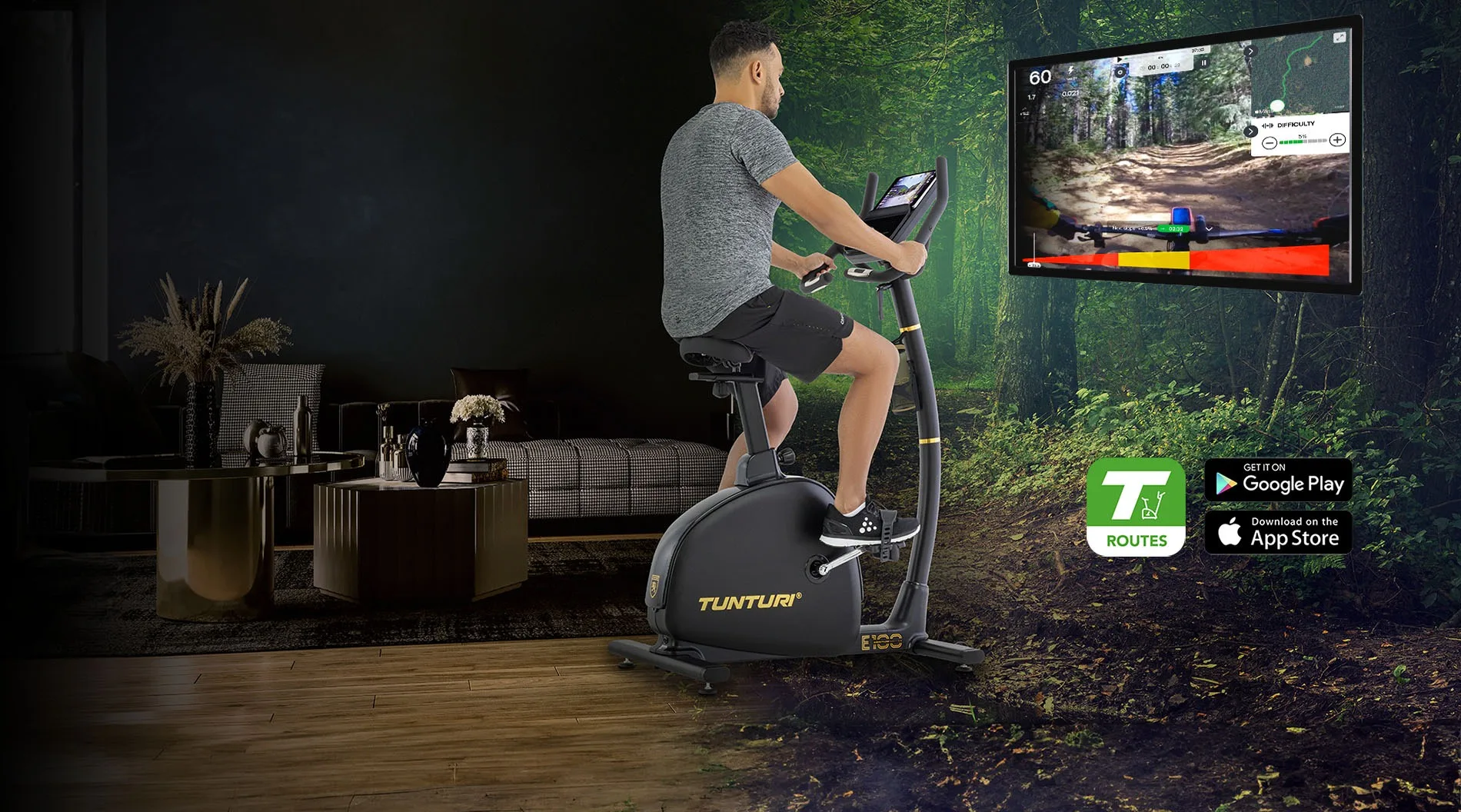 Ühenda E100 rakendusega Tunturi Routes, et pääseda ligi videoradadele üle maailma. Tasuta versioonis on saadaval 15 raja, tasulises aga sajad. Zwiftiga ühildamisel kohandub video sinu pedaalimise tempoga, pakkudes ülirealistlikku treeningkogemust. iConsole+ rakendusega saab AI luua sinu tulemuste põhjal personaalse treeningplaani.