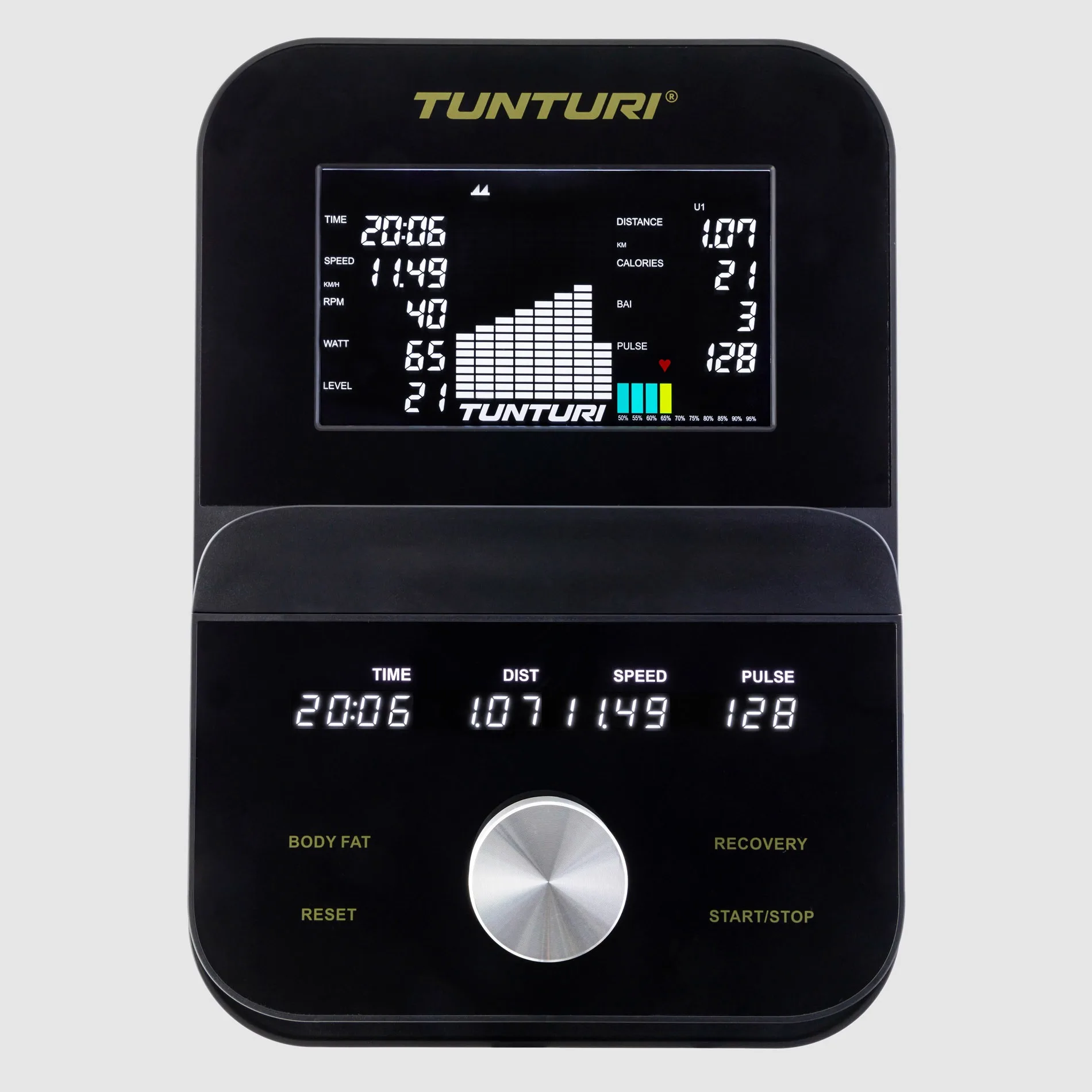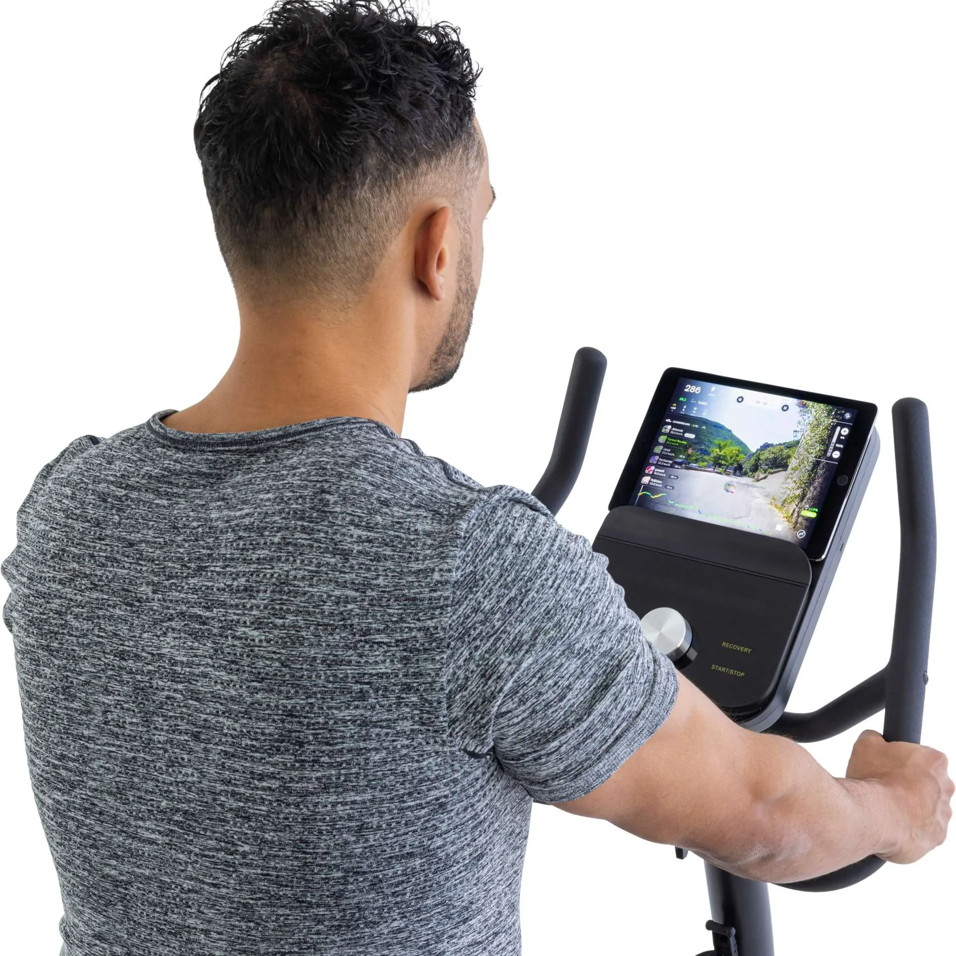 Bluetoothi AI-monitor kuvab kõik tähtsad treeningnäitajad: aeg, distants, kalorid, kiirus, koormus, pulss, RPM, profiil ja vatt. Monitori saab kallutada, et vaatenurk oleks alati optimaalne. Tahad treenimise ajal sarja või filmi vaadata? Tahvelarvutihoidik võimaldab seda mugavalt teha — isegi tahvelarvutit kasutades jäävad neli peamist näitu ekraanil nähtavaks.