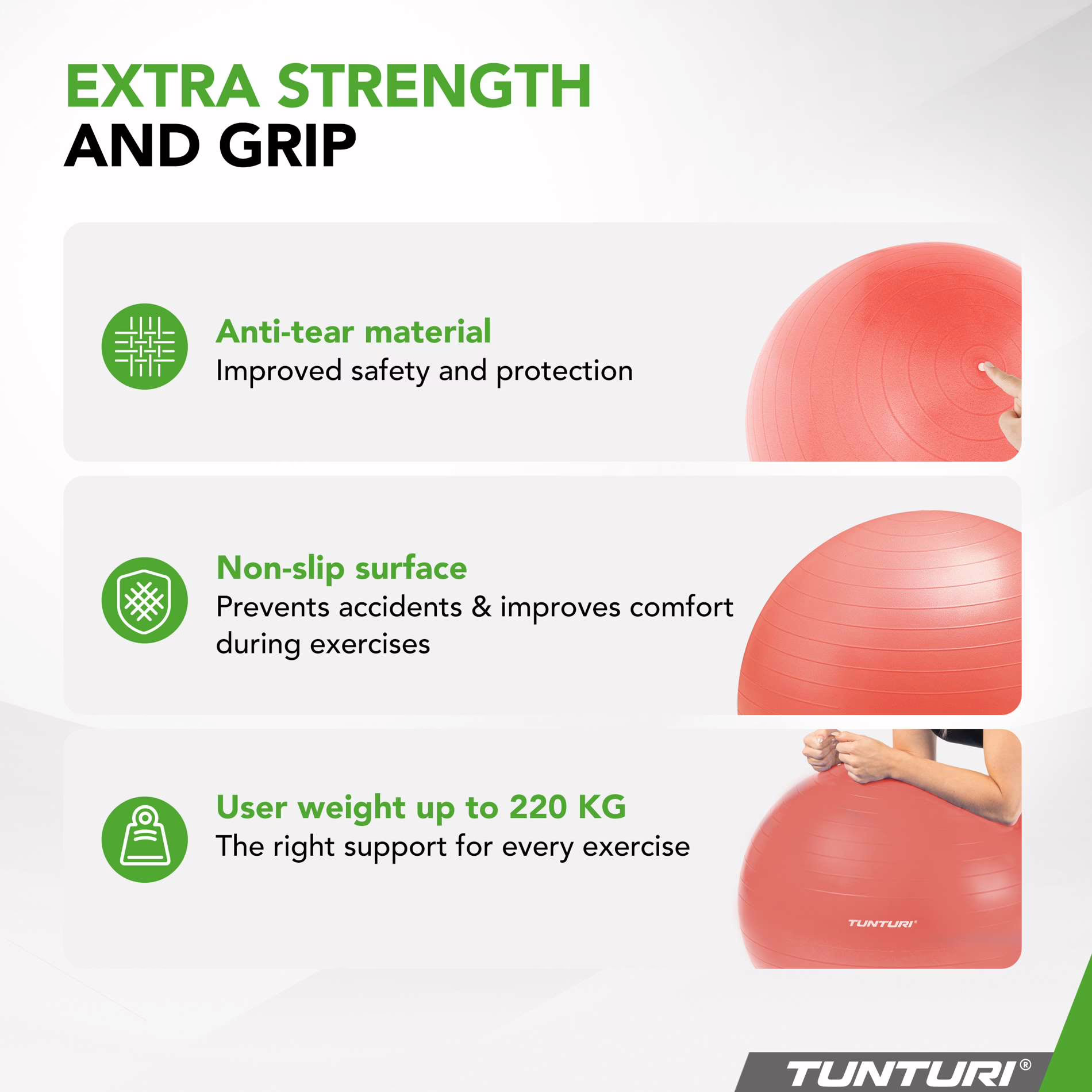 Tunturi Anti-Burst võimlemispalli eelised ✓ Edendab tervislikku istumist ja kehahoiakut ✓ Tugevdab ja lõdvestab lihaseid ja liigeseid ✓ Parandab tasakaalu, koordinatsiooni ja jõudu ✓ Aitab leevendada selja- ja kaelavalu ✓ Pakub optimaalset tuge taastusravis, raseduse ajal ja töökoha istmel Stimuleerib tervislikku kehahoiakut ja istumist Lisaks lihaste tugevdamisele ja paindlikkuse säilitamisele aitab treeningpall parandada tervislikku istumisasendit. Regulaarne istumine pallil stimuleerib selja- ja kõhulihaseid, aidates kaasa paremale kehahoiakule. Optimaalne tugi treeningutel, taastusravis ja raseduse ajal Olgu see treening, taastusravi või rasedus, Anti-Burst fitness-pall pakub sobivat tuge igaks olukorraks.