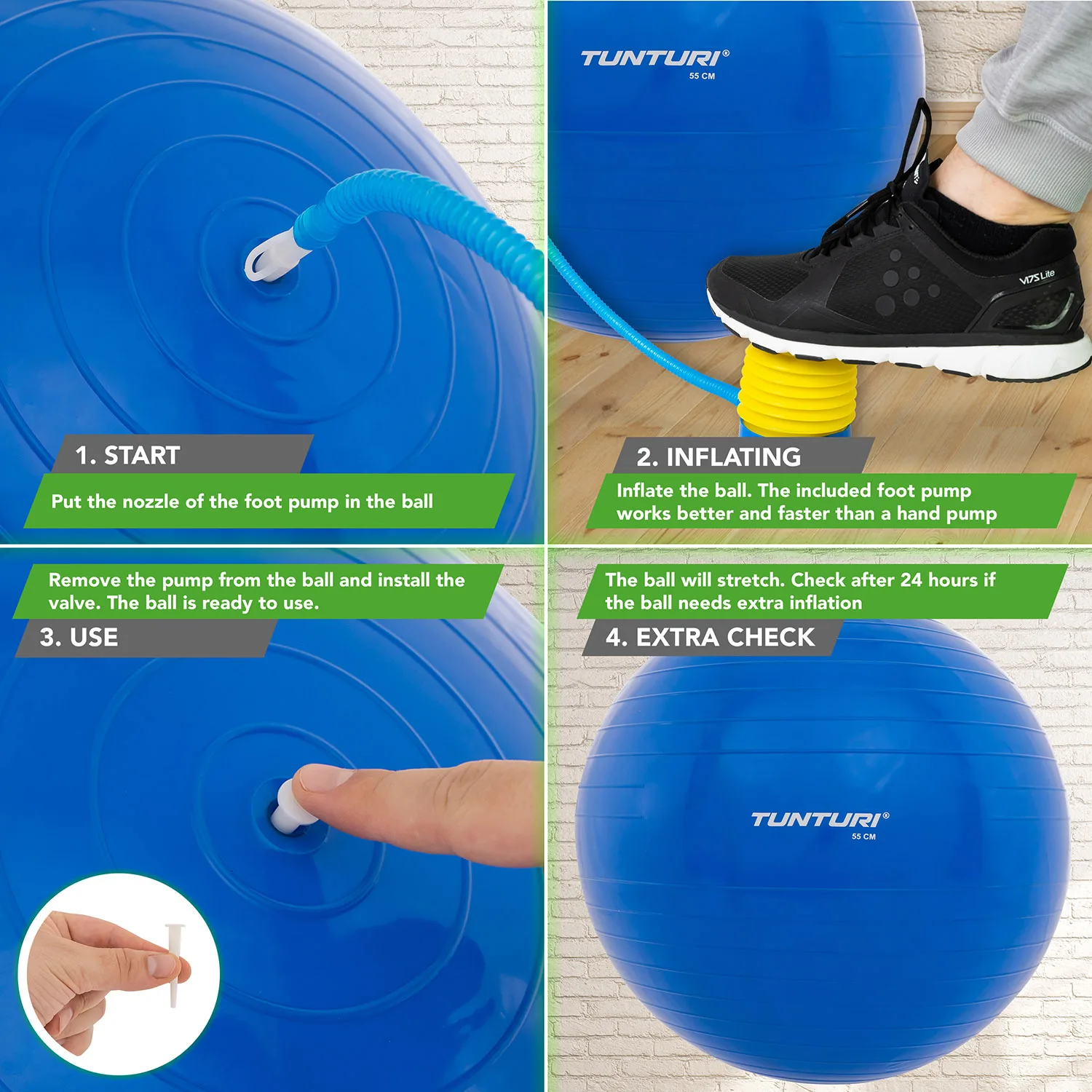 Komplektis on pump ja kaks ventiili, mis muudavad palli täispuhumise ja tühjendamise lihtsaks. Palli on mugav hooldada, kuna see on valmistatud kvaliteetsest anti-burst materjalist. Tasuta Tunturi treeningu äpp/rakendus Otsid abi, inspiratsiooni või motivatsiooni oma treeninguks?