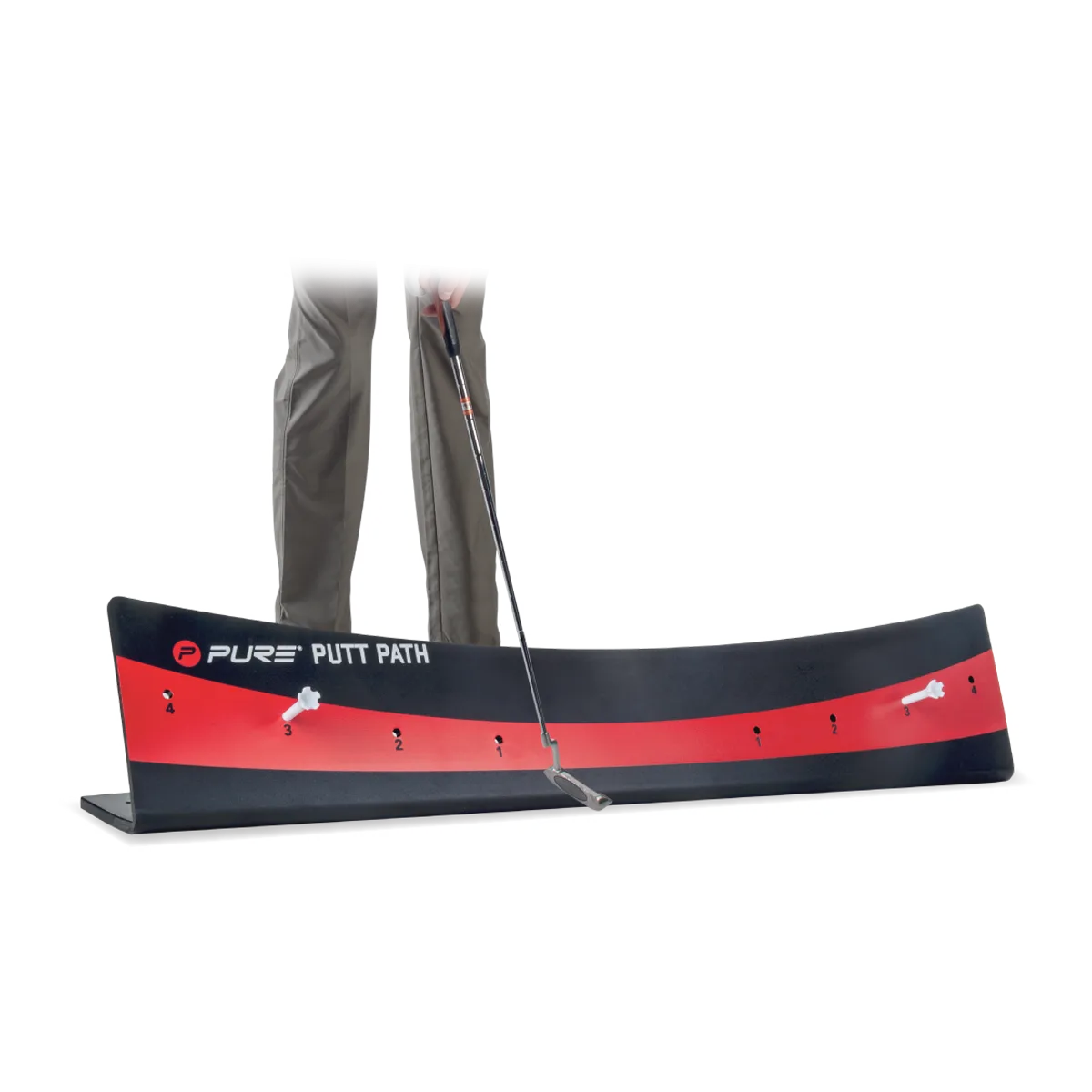 Pure 2Improve Puttamise harjutusrada. Must/punane. Unikaalne kuju seab paika õige golfikepi liikumise puttamisel. Võib kasutada murul, kodus või kontoris Sisaldab juhendeid, kuidas löögi pikkust ühtlustada.