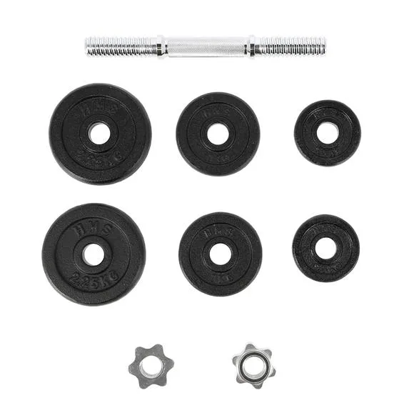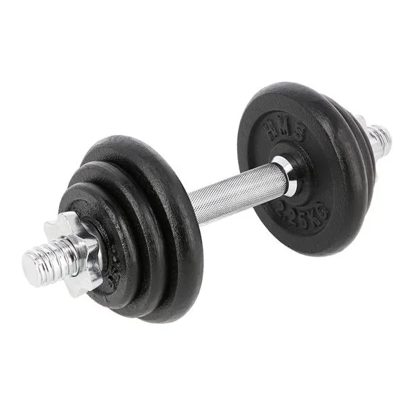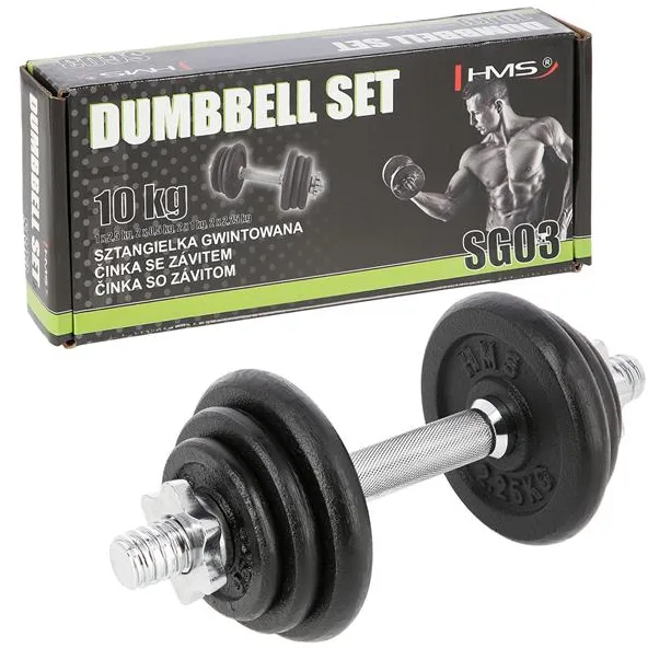 Metallist muudetava raskusega hantel 10kg HMS - klassikaline keermestatud hantel, mis on valmistatud kvaliteetsetest materjalidest, on kohustuslik igas kodus. Komplekti kuuluvad: nikeldatud terastang ja rauast valatud plaadid. Tangil on sooniline käepide, nii et see ei libise treeningu ajal.