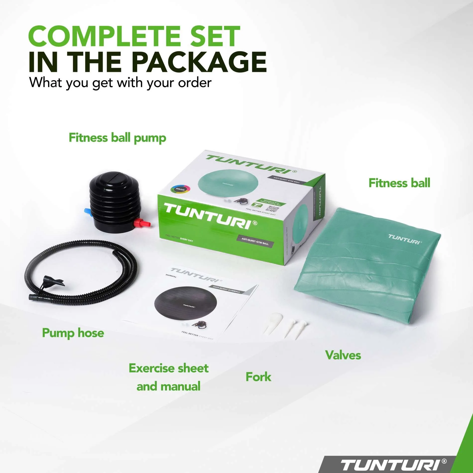 1x Anti-Burst võimlemispall 1x Pump 1x Kahvel 2x Ventiilid 1x Harjutuskaart 1x Kasutusjuhend